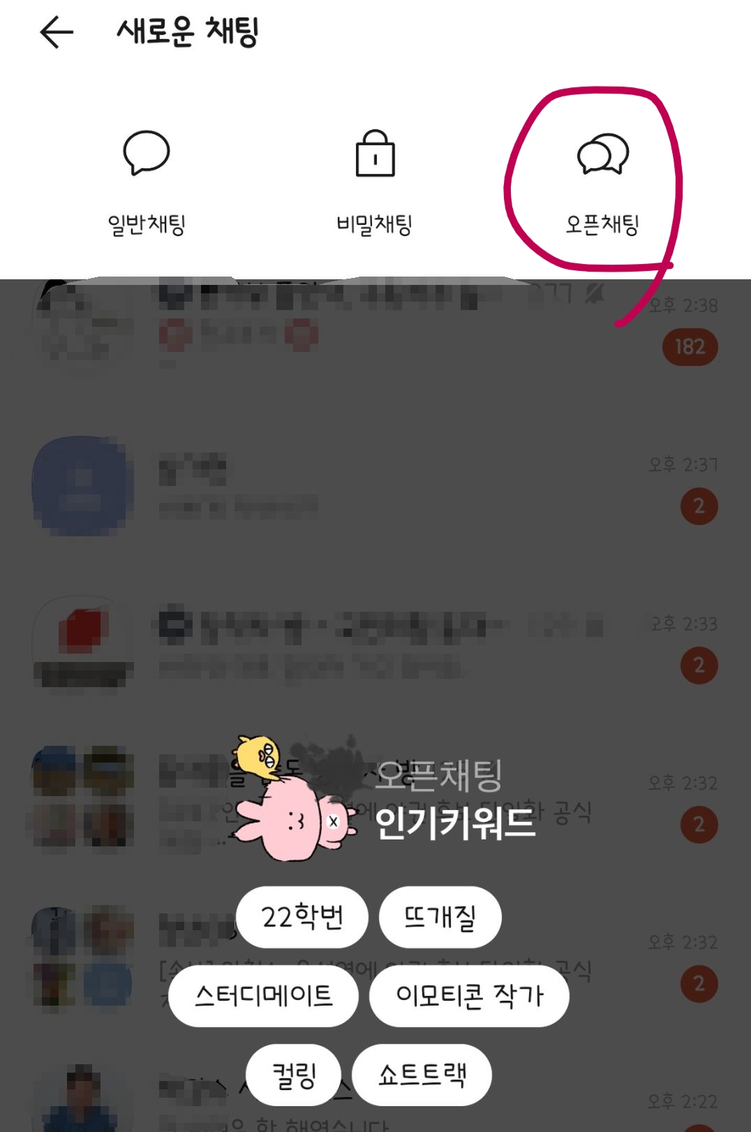 4. 맨 우측의 '오픈채팅'을 클릭 (일반 채팅, 비밀채팅 옆에 있음)